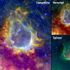 Gan Spitzera, gan Heršela teleskopu attēlos labi redzams materiāla gredzens, kuru saspieda un uzkarsēja masīvo un karsto jauno zvaigžņu ultravioletais starojums. Spitzera teleskopa attēlā šīs zvaigznes īpaši neizceļas uz pārējo spīdekļu fona. Heršela teleskops spēj pamanīt visaukstākos putekļus un gāzi, kas redzami attēla ārmalās sarkanīgos un dzeltenīgos toņos. Siltākie putekļi spīd arī īsākos viļņu garumos, kurus reģistrē arī Spitzera teleskops.